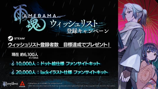 キャンペーンでは目標登録数を達成すると、ファンサイトキットがプレゼントされるほか、『雨魂 - AMEDAMA -』のSteam無料体験版も配信中だ。
