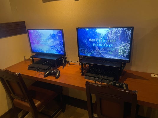 ■店内設置のモニターにて『モンスターハンターワールド:アイスボーン』の協力プレイが可能!