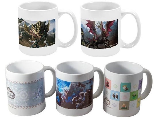 『モンスターハンターライズ』『モンスターハンターライズ:サンブレイク』のキービジュアルのマグカップ、『モンスターハンターワールド:アイスボーン』より、イヴェルカーナアイコンデザイン(下左)、キーヴィジュアルのデザイン(下中央)、環境生物をあしらった可愛いデザイン(下右)のマグカップ。