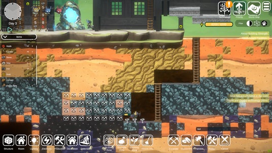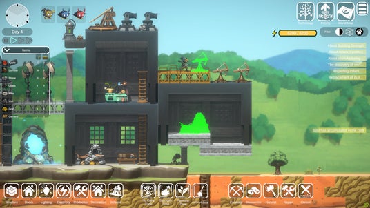 苗木の背中にはさまざまな建築ができる。「コア」を守るための壁、魔物を倒すための兵器、使い魔たちが作業する部屋など、プレイヤーの戦略によってどのような建築をするのかは大きく変わる。