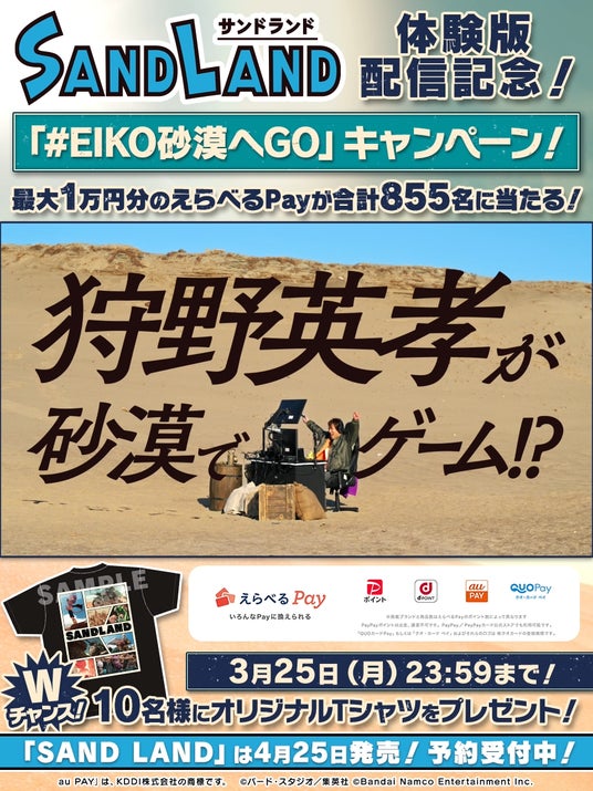 体験版配信開始と狩野英孝さんのプレイ動画を公開したことを記念して、X(旧Twitter)にてキャンペーンが開催中!ゲーム『SAND LAND』公式をフォロー&該当投稿をリポスト&「#EIKO砂漠へGO」をつけて投稿すると、抽選で最大1万円分のえらべるPayが合計855名様に当たる!さらにWチャンスキャンペーンでSAND LANDオリジナルTシャツも!キャンペーン詳細はこちら:https://sandland-g.bn-ent.net/news/eikosandgocmp/
