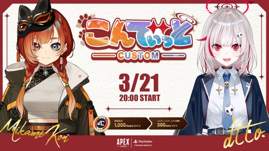 プロeスポーツチーム「REJECT」所属の「巫神こん」と「dtto.」の冠大会である「こんでぃっとカスタム」が2024年3月21日(木)に開催される。PlayStationコミュニティ向けの『Apex Legends』カスタムマッチとなり、巫神こんとdtto.率いる「こんでぃっとチーム」と公募の19チーム、合計20チームが競い合う。