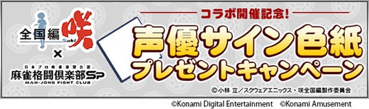 コラボイベント開催を記念して、『麻雀格闘倶楽部Sp』公式Xアカウントにて、「咲-Saki-全国編コラボ開催記念!声優サイン色紙プレゼントキャンペーン」を開催します。TVアニメ『咲-Saki-全国編』コラボイベントでプチプロとなったキャラクター3名を担当する各声優のサイン色紙が抽選で当たるキャンペーンとなっています。