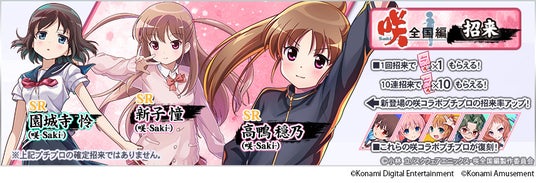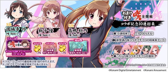 「おまけ付き咲-Saki-全国編コラボ記念10連招来」では、プレーヤー情報を表示する際に使用するオプションパーツ、「新子 憧(咲-Saki-)」や「園城寺 怜(咲-Saki-)」の背景画像「卓背景」など対局を彩るアレンジアイテムがもらえます。