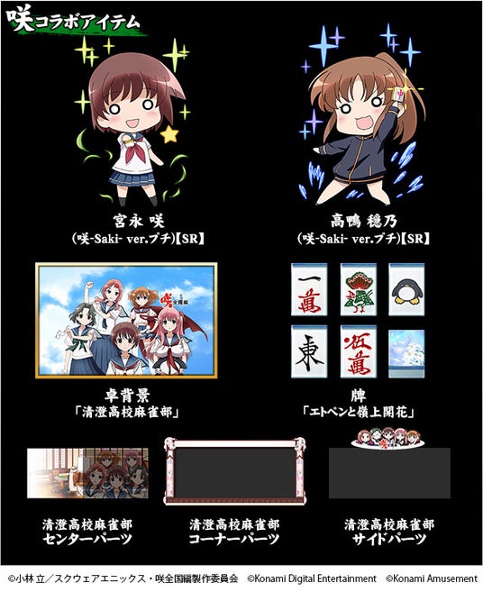 ゲーム内アイテム「雀石(じゃんせき)」を消費することで、プチプロ「宮永 咲(咲-Saki- ver.プチ)」「高鴨 穏乃(咲-Saki- ver.プチ)」の他、ゲーム内の牌やプレーヤーパネル、卓背景などをカスタマイズできるコラボアイテムを獲得できます。