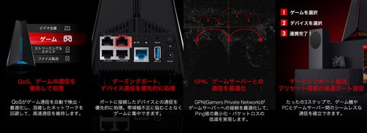 ゲーマーにとって、ネットワーク遅延は勝敗を分ける重要な要素。ゲームプレイに特化した4つの先進機能を搭載し、圧倒的な低遅延を実現します。自動最適化QoSで常に高速通信をキープし、ゲーミングポートでデバイスの通信を優先処理。GPNがゲームサーバーとの通信を最適化し、3ステップの簡単セットアップでゲームに最適なポート設定が可能です。