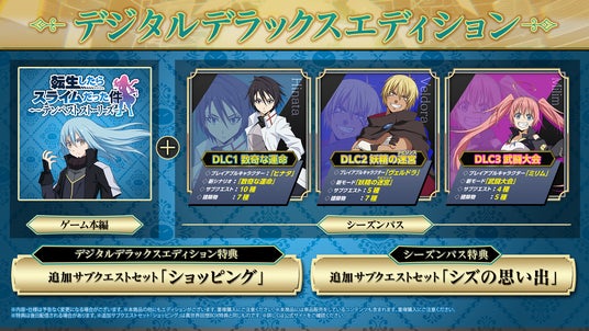 ※「DLC1 数奇な運命」「DLC2 妖精の迷宮(ラビリンス)」「DLC3 武闘大会」をプレイするには、「転生したらスライムだった件 テンペストストーリーズ」本編をクリアする必要があります。