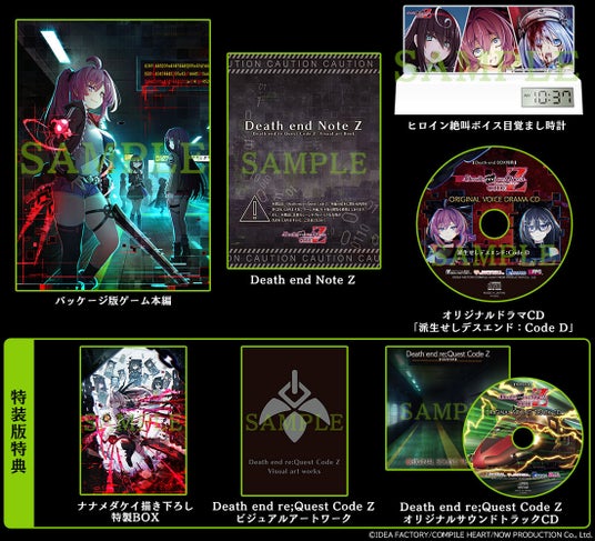 豪華なグッズが満載の豪華版パッケージ「Death end BOX」も同時発売!ゲーム本編同梱の特装版パッケージに加え、さらに多数のグッズを収録した豪華な内容となっています。