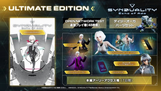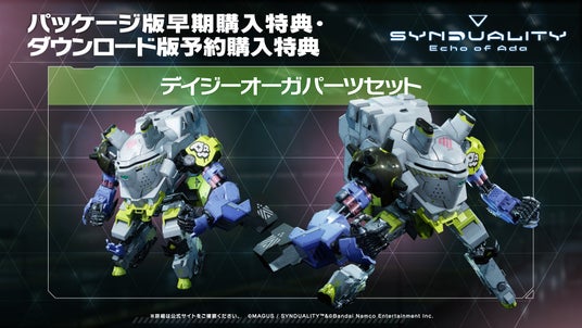 アーリーアクセスは1月16日(木)から開始され、予約特典としてアニメ『SYNDUALITY Noir』の主人公・カナタが搭乗する「デイジーオーガパーツセット」が入手可能。デラックスエディションやアルティメットエディションを予約すると最大7日間のアーリーアクセス権が得られ、アルティメットエディションでは「Noir型メイガス」や「Mystere型メイガス」が手に入る。