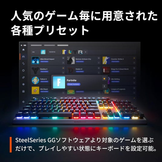アクチュエーションレベル、キーバインド、ラピッドトリガーのオンオフ、マクロ及びRGBライティングなど、各ゲームに最適な設定をご用意。ソフトウェア「GG」より対象のゲームを選ぶだけで、プレイしやすい状態にキーボードを設定することができます。