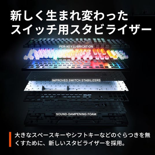 キーの安定性を向上する新しいスタビライザーを採用し、主にスペースキーやシフトキーなどの大きなキーのぐらつきを劇的に改善し、スタビライザーの潤滑剤処理を見直すことで、キー全体のタイピング音を向上します。