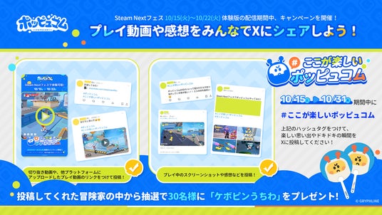 Steam Next フェスにて最新体験版を公開すること合わせて、『ポッピュコム』公式XにてSteamキー(ゲームコード)やグッズが当たる記念キャンペーンも実施します。