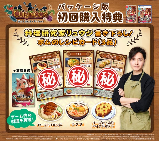 『キュイジニア ポムとまんぷくダンジョン』(Switch/PS5)パッケージ版購入特典を公開!初回購入特典は、料理研究家リュウジさん書き下ろしポムのレシピカード(3品)が付属!