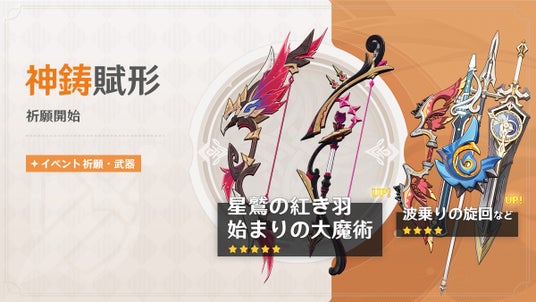 11月20日(水)アップデート後より、イベント祈願・キャラクター「紅を散らす矢羽」、イベント祈願・キャラクター2「光と影のトリック」を開催しました。期間中、ピックアップキャラクターの出現確率が大幅にUPします。