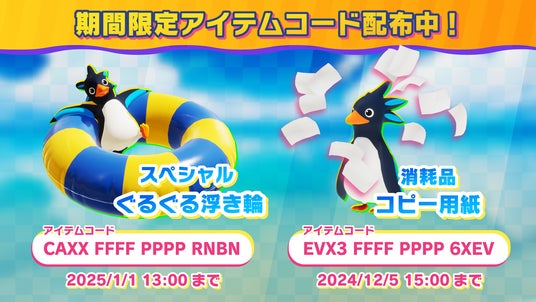事前登録50万人達成記念アイテム「ぐるぐる浮き輪」と、期間限定イベント「全力全開ワーケーション!」の消耗品「コピー用紙」のアイテムコードを配布中です!