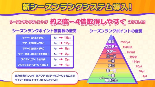 シーズンランクポイントが従来よりも約2倍~4倍取得しやすくなりました!実力が表れつつも、各アクティビティをゴールすることでポイントを積み上げていけるシステムになっています。