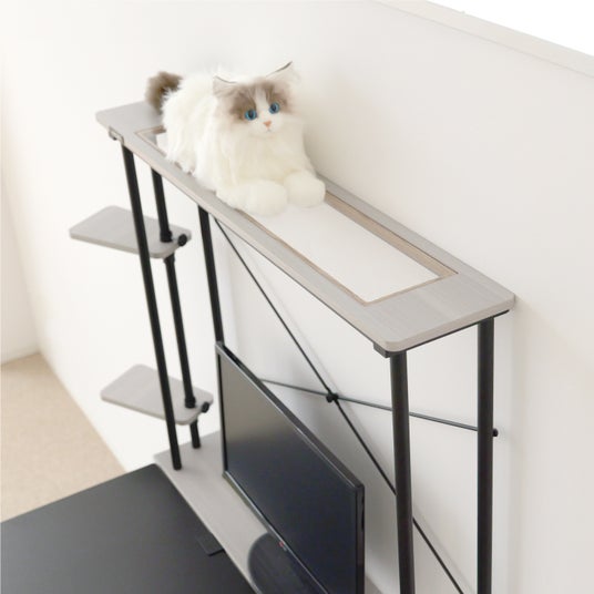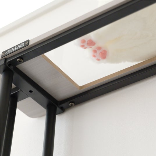 上段は、アクリルパネルをはめ込んだクリア仕様。猫飼いならば誰もが一度は憧れる「肉球キャットウォーク」を、自宅で簡単に実現可能です。壁に穴を開けずに設置できるので、賃貸住まいでもOK。ゲーミングチェアに座ったままの姿勢で、猫のかわいい肉球&おなかが堪能できます。