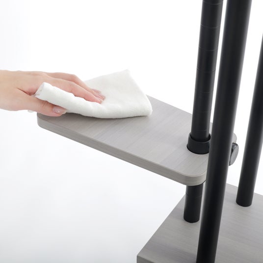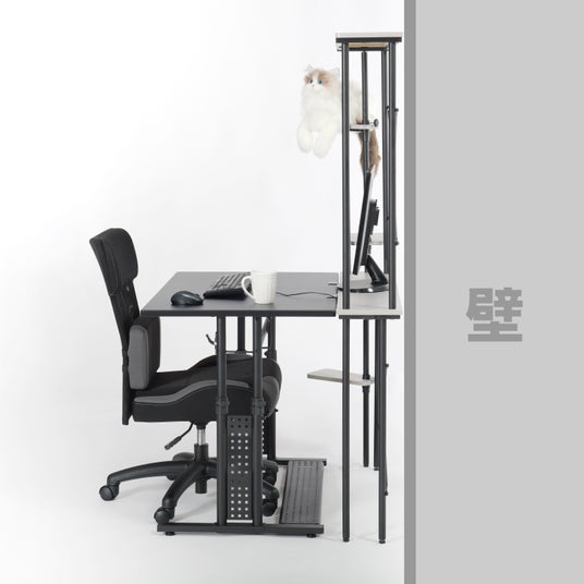 奥行き20cmのスリム仕様ながら、デスクと連結させることで土台の接地面積を広く確保。机と壁のわずかな隙間へ設置できる省スペース性と、猫を安心して遊ばせられる高い安定性を両立しています。