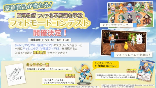 ゲームの発売を記念して「フォトモードコンテスト」が開催されており、スクリーンショットを指定のハッシュタグ「#魔導フィアSS」と共に投稿することで、出演声優のサイン色紙や描き下ろしアクリルスタンドなどの豪華賞品が当たるチャンスが!加えて、2024年12月15日までにデジタル版を購入した人には、魔導師の帽子や特製アイテムが手に入る「早期購入特典」がプレゼントされる。