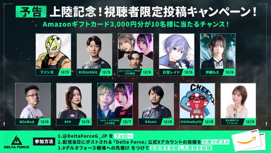 『Delta Force』の日本公式Xアカウントをフォローし、ハッシュタグ「#デルタフォース戦場への先駆け」と視聴した感想を添えて、生配信もしくは動画公開当日に『Delta Force』公式Xアカウントで投稿されるキャンペーン告知投稿を引用ポストすると、Amazonギフト券3,000円分が当たるチャンスがあります。