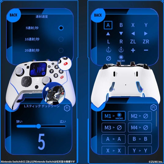 - スティックのデッドゾーン、アウターデッドゾーン、反応曲線機能でゲームに合わせて、より自分のプレイにあった操作感度調整が可能で、他には味わうことができない新たなゲーム体験が実現できます。また、Turbo‐Zボタンを使うことでゲーム中のボタン連射がスムーズに展開でき、ゲームプレイの幅をより広げることが可能になります。