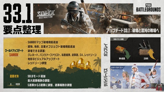KRAFTON JAPAN株式会社(代表取締役 イ・カンソク)は、『PUBG: BATTLEGROUNDS』(以下PUBG)において、33.1のアップデートを実施しましたことをお知らせいたします。