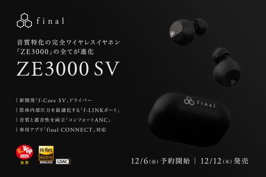 株式会社finalは、音質と機能性を両立させた完全ワイヤレスイヤホン「ZE3000 SV」を2024年12月6日より予約開始、12月12日より発売予定で発表した。新モデルは、代表的な有線イヤホン「E3000」と「ZE3000」の技術を融合し、10mmドライバー「f-Core SV」や音響空間の最適化を実現する「f-LINKポート」を搭載し、低域やボーカル再生を大幅に改善。