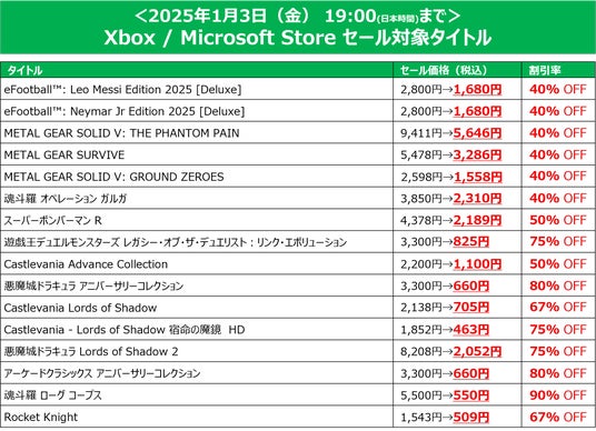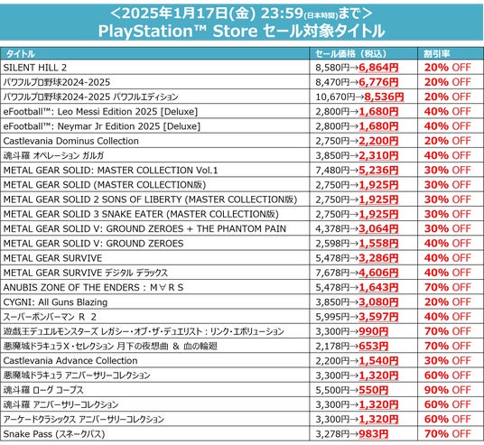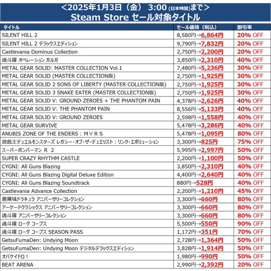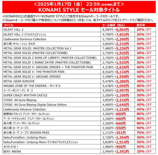 株式会社コナミデジタルエンタテインメント(以下、KONAMI)は、PlayStation™ Store、ニンテンドーeショップ、 Steam Store、Xbox/Microsoft Store、KONAMI STYLEで、ダウンロード版のゲームをお得に購入できるKONAMI「年末年始セール」を開催中です。