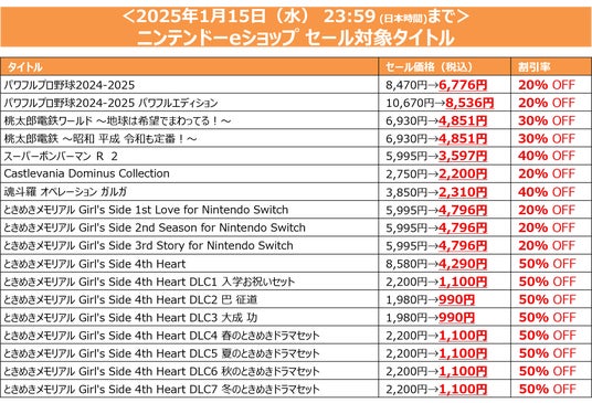 さらに、ニンテンドーeショップでは、家族や友達と楽しめるボードゲーム『桃太郎電鉄ワールド ~地球は希望でまわってる!~』が30%オフとなる他、ときめく3年間が楽しめる学園恋愛シミュレーションゲーム「ときめきメモリアル Girl‘s Side」シリーズ作品が最大50%オフとなります。