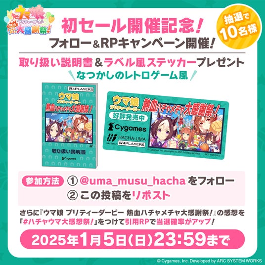 2024年12月20日より、Nintendo Switch™、PlayStation®4、Steam®向けゲーム『ウマ娘 プリティーダービー 熱血ハチャメチャ大感謝祭!』の初セールを実施中。セール期間はNintendo eショップとPlayStation™Storeが2025年1月6日まで、Steam®ストアが2025年1月3日までとなっており、対象ゲームは30%OFFで販売されている。さらに公式Xでフォロー&リポストキャンペーンも同日開催中で、パッケージ付属のアイテムが抽選で10名に贈られる。