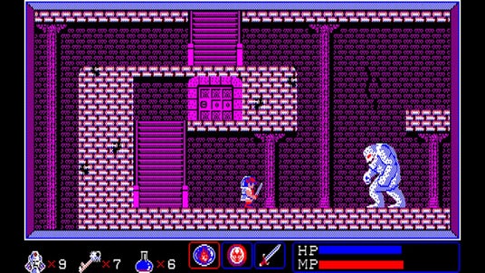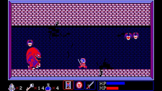 基本はサイドビューながら、移動とジャンプの操作は軽快。剣を持って体当たりをしたり、アイテムを使って敵と戦っていく。アイテムの取得や装備の自由度が高いため、手持ちの装備より弱い武器なども取れてしまうのは当時のゲームならでは。アイテムは復活するので、再度強い武器を取ることも可能だ。