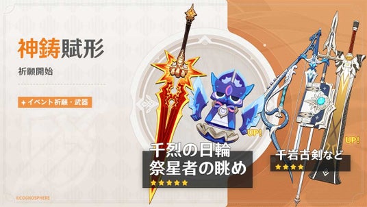 期間中、新★5武器「両手剣・千烈の日輪」、「法器・祭星者の眺め」などの出現確率が大幅にUPします。