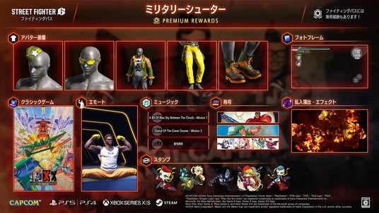 株式会社カプコンは『ストリートファイター6』において、ミリタリーをテーマにした「ミリタリーシューター」ファイティングパスを配信した。このパスでは、カプコンの人気シューティングゲームにインスパイアされたアイテムが多数登場し、アバター装備やエフェクトなどが提供され、プレイヤーはバトルハブでの勝利を目指してこれらを使用できる。