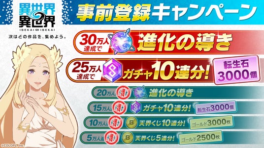 株式会社コロプラは、2025年1月27日にサービス開始予定の新作スマートフォン&PC向けゲーム『異世界∞異世界』の事前登録者数が20万人を突破したことを発表。サービス開始時にガチャ10連分のアイテムが配布されることが決定した。