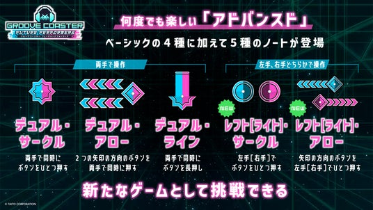 『グルーヴコースター フューチャーパフォーマーズ』では、熟練度に合わせて2つのプレイスタイル「ベーシック」と「アドバンスド」から選んでお楽しみいただけます。