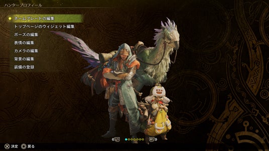 ハンターとオトモアイルー、セクレトのポーズや表情を変更することができます。ある時点のハンターやオトモ、セクレトの見た目と装備情報をハンタープロフィールに固定登録することもできます。