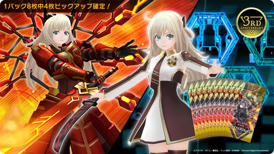 本キャンペーンでは、人気カード「E-HERO ネオス」のイラスト違い(UR/ロイヤル加工)やロイヤル加工のURカードが手に入る「3rd アニバーサリーパック」が引けるチケット、合計1,000ジェムなどをプレゼントするログインボーナスや、「閃刀姫―レイ」「閃刀姫ーハヤテ」「閃刀姫ーシズク」のイラスト違い(UR)などが出現するパック、「閃刀姫」テーマをモチーフとした3周年記念セットの登場など、豪華な内容となっています。