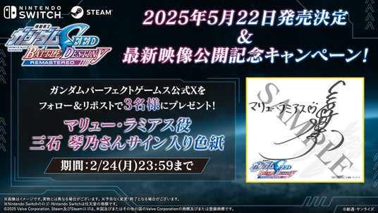 株式会社バンダイナムコエンターテインメントは、2025年5月22日にNintendo Switch™およびSTEAM®向けに『機動戦士ガンダムSEED BATTLE DESTINY REMASTERED』を発売することを発表した。本作は、2012年に発売された『機動戦士ガンダムSEED BATTLE DESTINY』のリマスター版で、グラフィックや操作性が大幅に改善され、より快適に楽しめるようになっている。