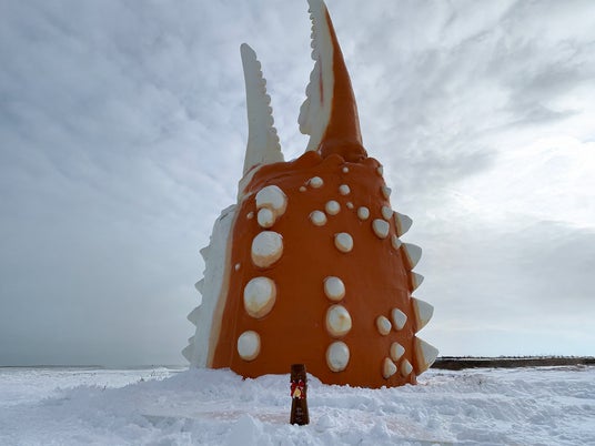 この日は、紋別のシンボル「カニ爪オブジェ」で記念撮影!