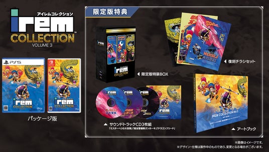Nintendo SwitchとPS5向けには同2025年7月10日に「アイレムコレクションVol.3」パッケージ通常版を4,400円(税込)で、豪華な特典付きのパッケージ限定版を9,350円(税込)で発売予定です。パッケージ通常版および限定版は2025年3月21日より各販売店で予約受付を開始致します。限定版はゲーム本編のほか収録タイトルの豪華サウンドトラックCD3枚組、アートブック、復刻版チラシセットなどの限定グッズを同梱したアイレムファンに向けたコレクターアイテムです。販売店オリジナル特典もございますのでこちらも是非チェックして下さい。