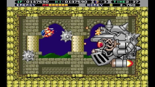 1987年にアーケード用に発売された横スクロールシューティングゲームです。崩壊しかけている惑星を救うため、小さな足のあるオレンジ色の愛らしいヘリコプター「ミスターヘリ」を操り、緑の浮遊島や動く岩盤地帯、地底の時計塔など様々なステージで敵を倒し障害物を回避しながら進んでいきます。途中水晶を集めるとパワーアップするアイテムを購入することができるので十分に強化して、地底奥底に潜む最終ボスMUDDYを倒すのが目的です。この時期のアイレム作品には珍しいポップで鮮やかなグラフィックとコミカルなキャラクターが特徴ですが、難易度は高く相当やり応えがあります。「アイレムコレクションVol.3」では1989年に発売されたPCエンジン版も収録しています。