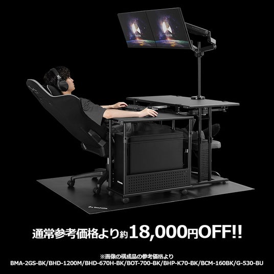 本セールの目玉は、全ゲーマーに捧ぐ、永遠のドリームデスク『寝ながらゲームシステム』!誰しも一度は憧れる「寝たままゲーム」の環境に必要な全構成品がセールの対象です。シリーズ内でも最高レベルの機能性を備えた「ゲーミングチェア G-530」や、昇降機能でベストな寝姿勢に調節できる「ゲーミングデスク BHD-1200M」を用いた、快適なゲーム環境をお得に構築できます。