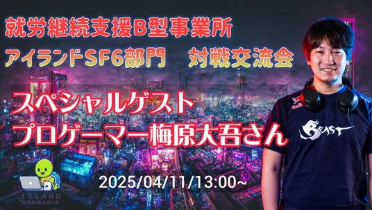 合同会社DKSKが運営する就労継続支援B型事業所アイランドは、プロゲーマー梅原大吾氏を招き、2025年4月11日にライブ配信を行うことを発表した。