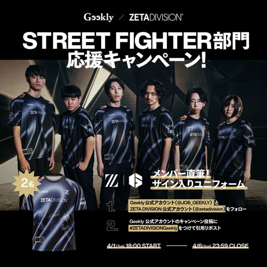 ZETA DIVISIONとギークリーのスポンサー契約締結を記念して、STREET FIGHTER部門の全メンバーのサイン入りユニフォームが当たるキャンペーンを実施いたします。