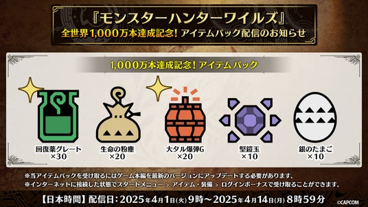 また1,000万本達成を記念して『モンスターハンターワイルズ』ユーザーの皆様に感謝の意を込めてアイテムパックを配信中です。ゲームにログインして期間内にお受け取りください。