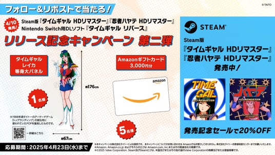 『タイムギャル リバース』の発売を記念して、タイトーゲーム(@Taito_apps)公式Xアカウントにて、Amazonギフトカードやポスターが当たるキャンペーンを実施します。詳しくは公式Xをご確認下さい。