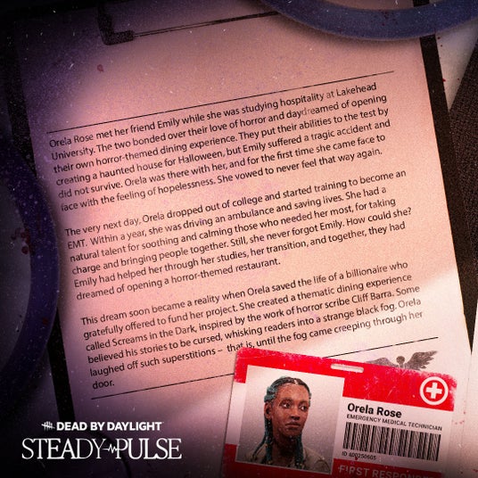 本チャプターで登場する新サバイバー「Orela Rose(オレラ・ローズ)」は、救急救命士として患者を暗闇から救い出す“光”のような存在として職務に専念してきた人物です。緊迫した救助活動、目を覆いたくなるような傷、苦痛に満ちた叫び声はどれも彼女にとって日常の一部でした。しかしエンティティの領域に迷い込んだ今、彼女がこれまでに培ってきた技術と覚悟は、かつてない試練にさらされることとなります…。