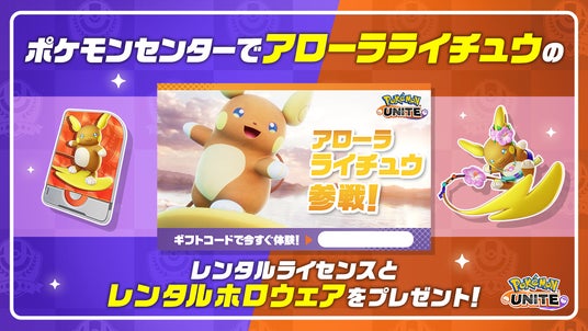 2025年4月18日(金)から5月4日(日・祝)まで、全国のポケモンセンターでお買い物をすると、『ポケモンユナイト』でのバトルが体験できるギフトコードをプレゼント。もらえるギフトコードは、アローラライチュウのレンタルライセンス(3日間)と「ビーチスタイル」レンタルホロウェア( 3日間)です。