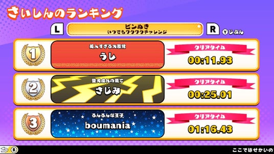 ランキングボードは各ミニゲームごとと、6種のミニゲームをミックスした形の7種類があり、それぞれ 「かんたん」「ふつう」「むずかしい」の3つのレベルに分かれています。