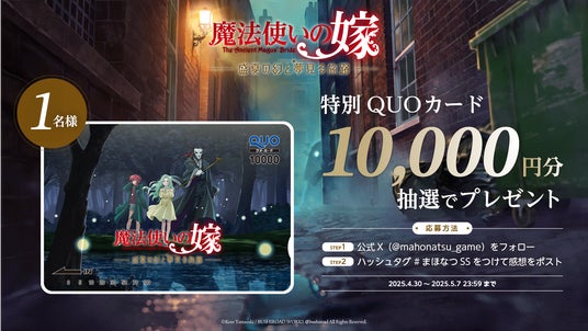 また、特別書き下ろし短編小説の公開を記念して、特別QUOカード10,000円分が当たる感想投稿キャンペーンも開催中!期間中に、公式Xアカウント(@mahonatsu_game)をフォローのうえ、ハッシュタグ「#まほなつSS」を付けて感想をポストした方の中から、抽選で1名様に特別QUOカード10,000円分をプレゼントいたします。皆様、奮ってご参加ください。